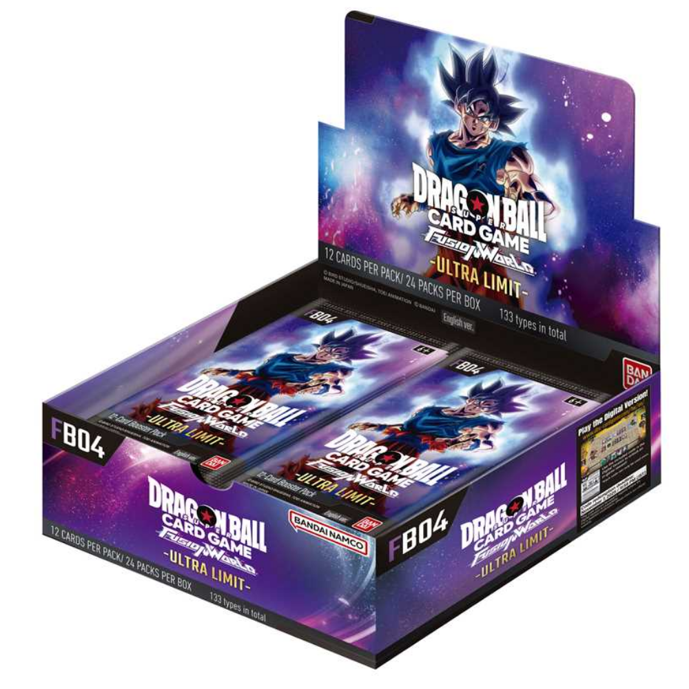 Upplev spänningen i Dragon Ball Super med Fusion World: Ultra Limit Booster Display! Detta spännande set introducerar 5 nya ledare i fem färger samt många nya karaktärer som tidigare inte funnits med i serien. Förstärk din lek med 143 kort, inklusive 22 parallella kort med unika illustrationer och tre "Premium Reprint Cards" med uppdaterade designer från Booster 1 till 3.