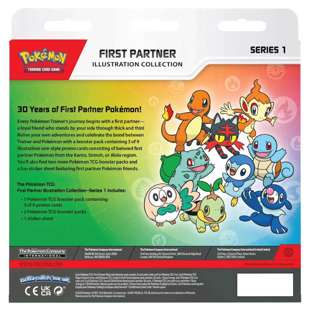 Fira 25 års Pokémon med First Partner Illustration Collection Box! Denna box innehåller tre exklusiva oversized illustrationskort som visar de ikoniska startpokémonerna i Kanto: Bulbasaur, Charmander och Squirtle. Perfekt för samlare och spelare som vill ha unika och vackra kort att visa upp eller lägga till i sina samlingar.