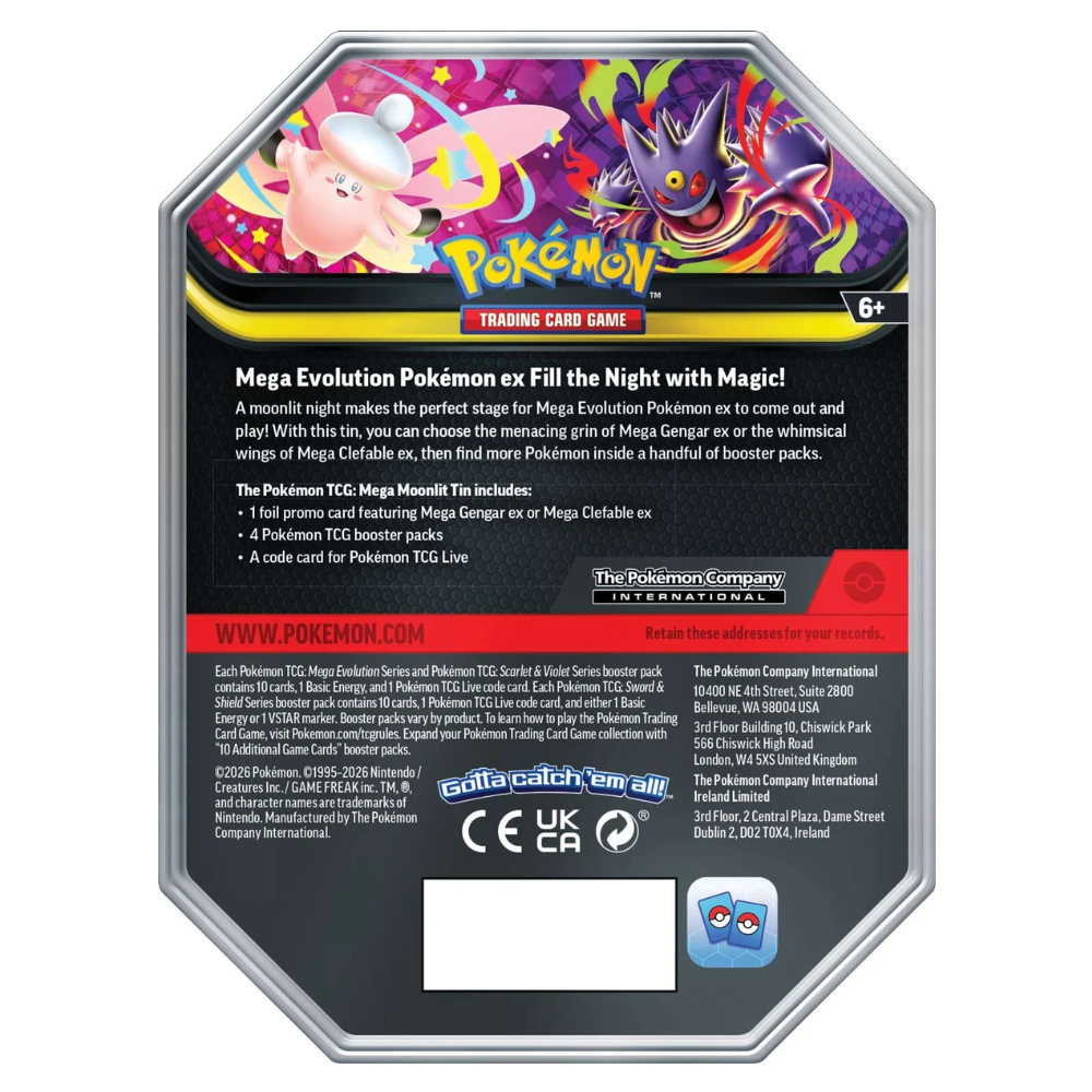 Kliv in i en mystisk nattvärld med Pokémon Mega Moonlight Mega Gengar ex Mini Tin (4 Pack) (ENG) från Pokémon. Denna stilfulla mini tin lyfter fram den ikoniska Mega Gengar ex, känd för sitt skrämmande leende och kraftfulla närvaro på slagfältet.