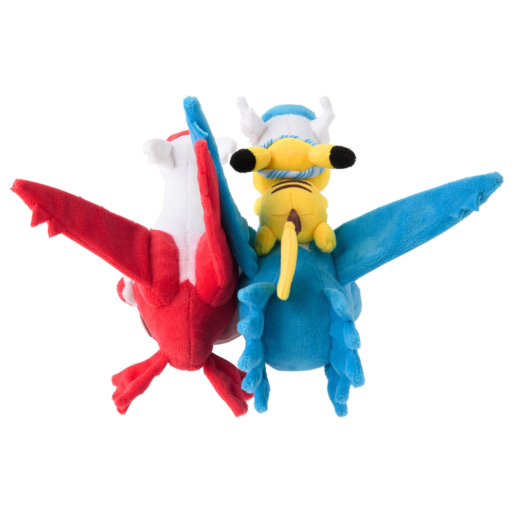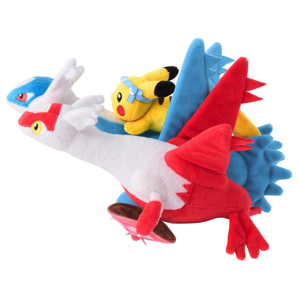 Utforska den livliga atmosfären från Pokémon Center Fukuoka med denna bedårande Latias & Latios x Pikachu Plush Toy! Den här exklusiva plushien förenar den legendariska duon Latias och Latios med allas favorit Pikachu i en färgstark och lekfull design som hyllar Fukuokas unika Pokémon-artwork.
