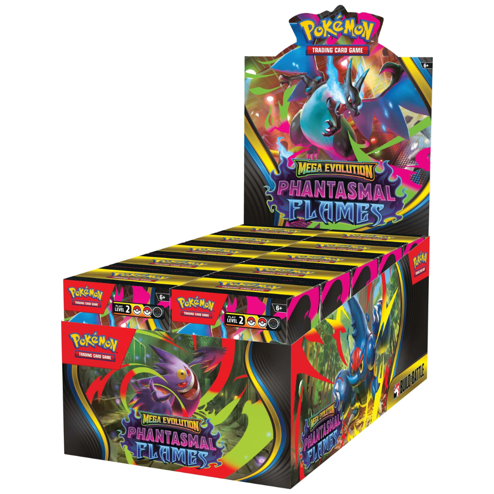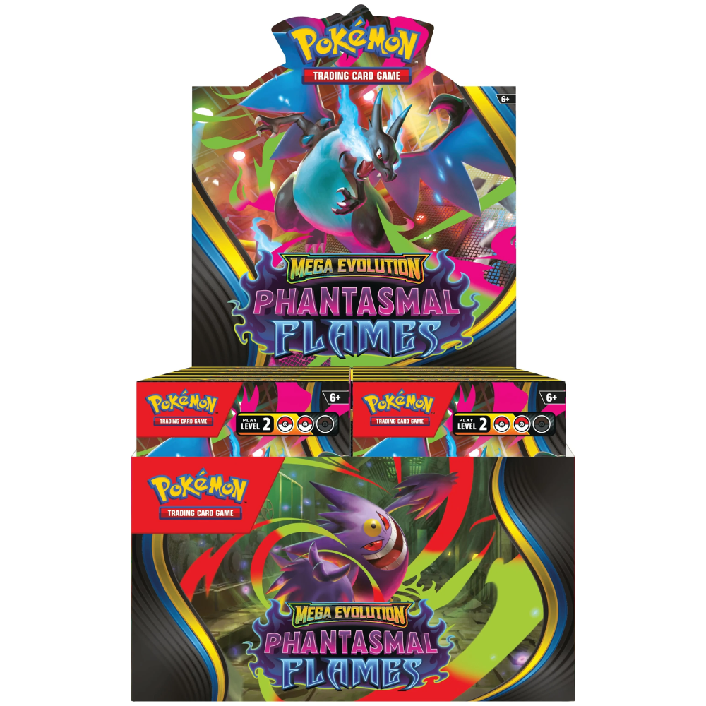 Searing blue flames river över ett mörkt slagfält när Mega Charizard X ex sveper fram och blickar ner på sina motståndare. I skuggorna reser sig Mega Gengar ex och flera andra Mega Evolution-Pokémon – redo att visa sin styrka i Pokémon TCG: Mega Evolution – Phantasmal Flames.