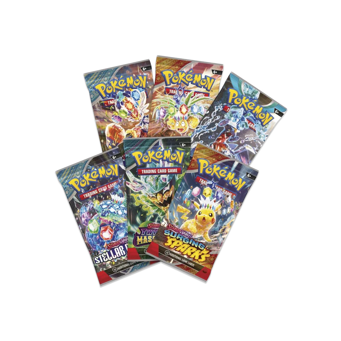 - 6 Pokémon TCG boosterpaket, slumpmässigt utvalda från serier som Surging Sparks, Twilight Masquerade och Stellar Crown (varje paket innehåller 10 kort)