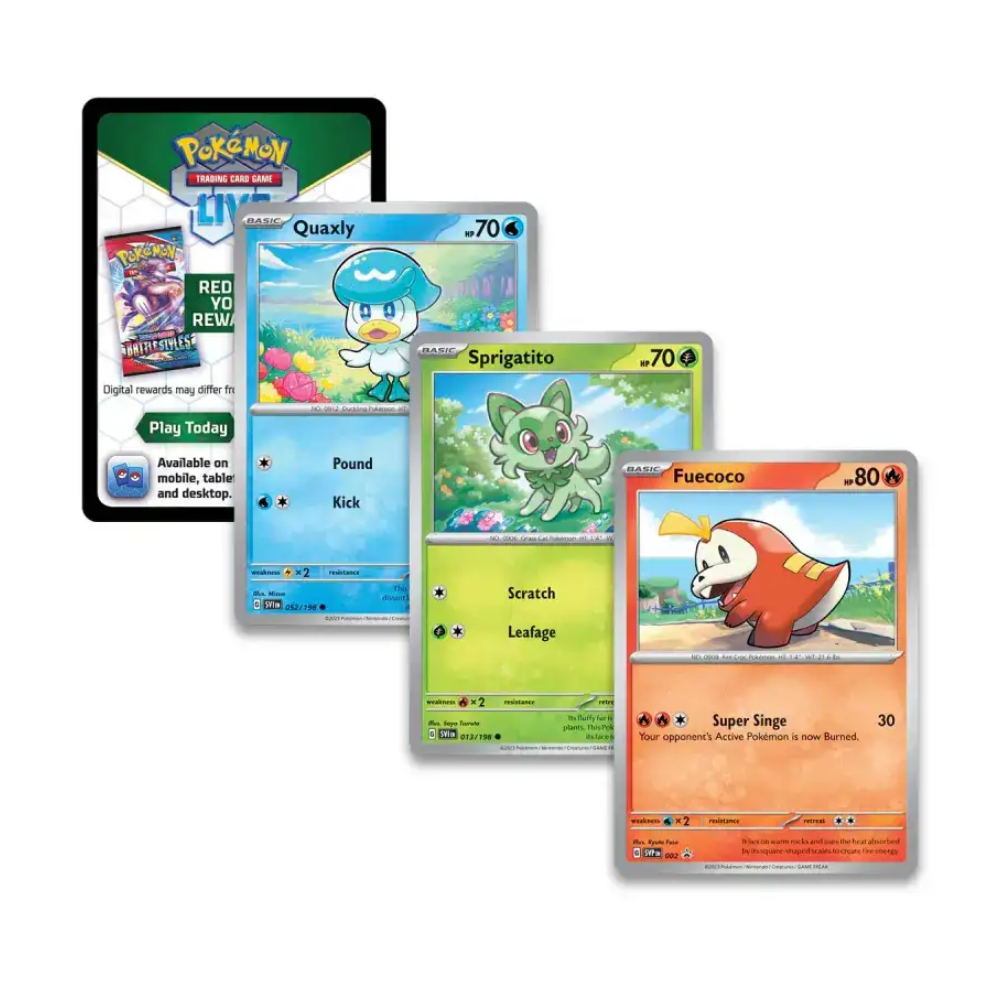 3 foil-promokort med Sprigatito, Fuecoco och Quaxly