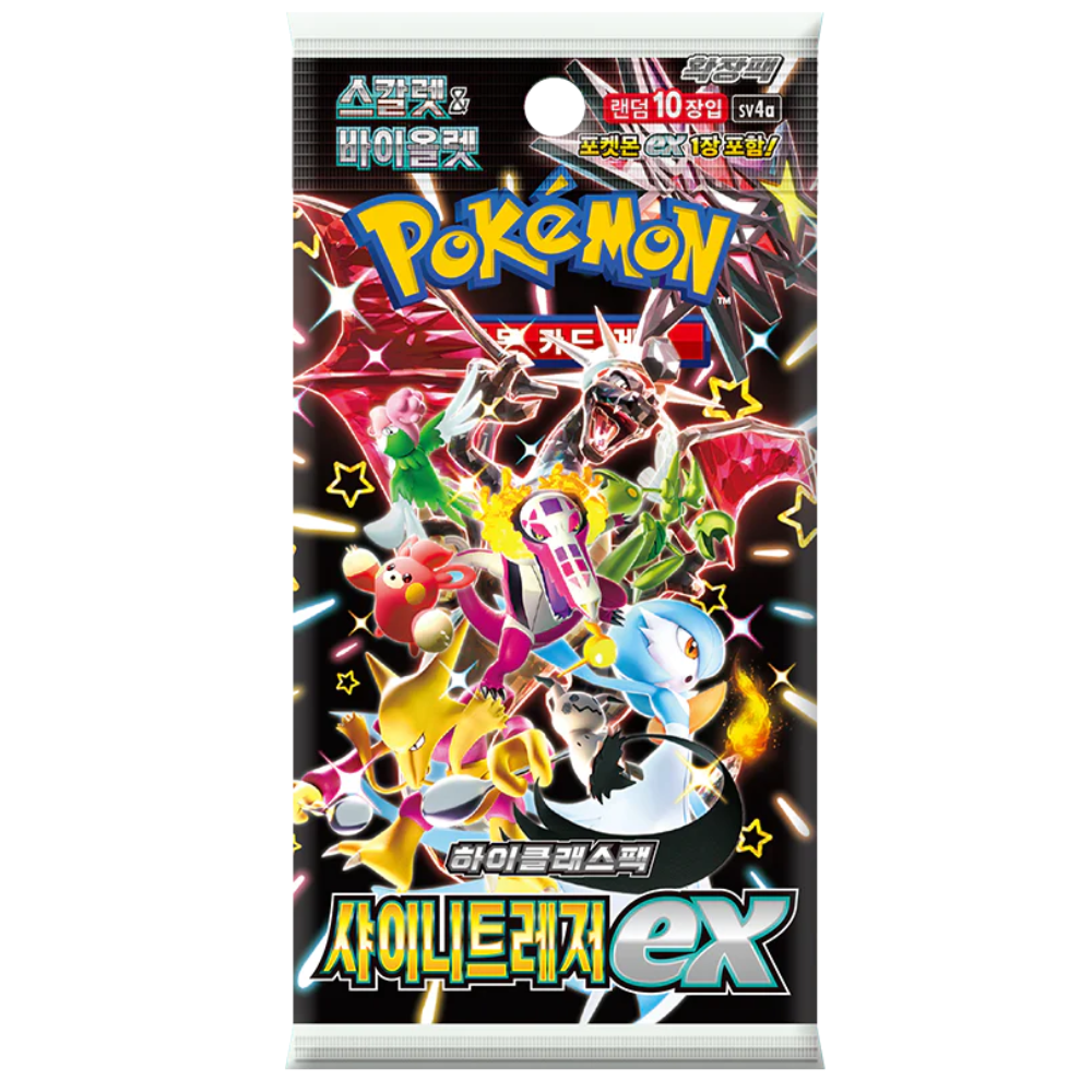 Lyxiga skatter väntar! Öppna dörren till en värld av glittrande kort med Pokémon Scarlet & Violet: Shiny Treasure EX SV4a Booster Pack – en eftertraktad koreansk utgåva för både samlare och spelare.
