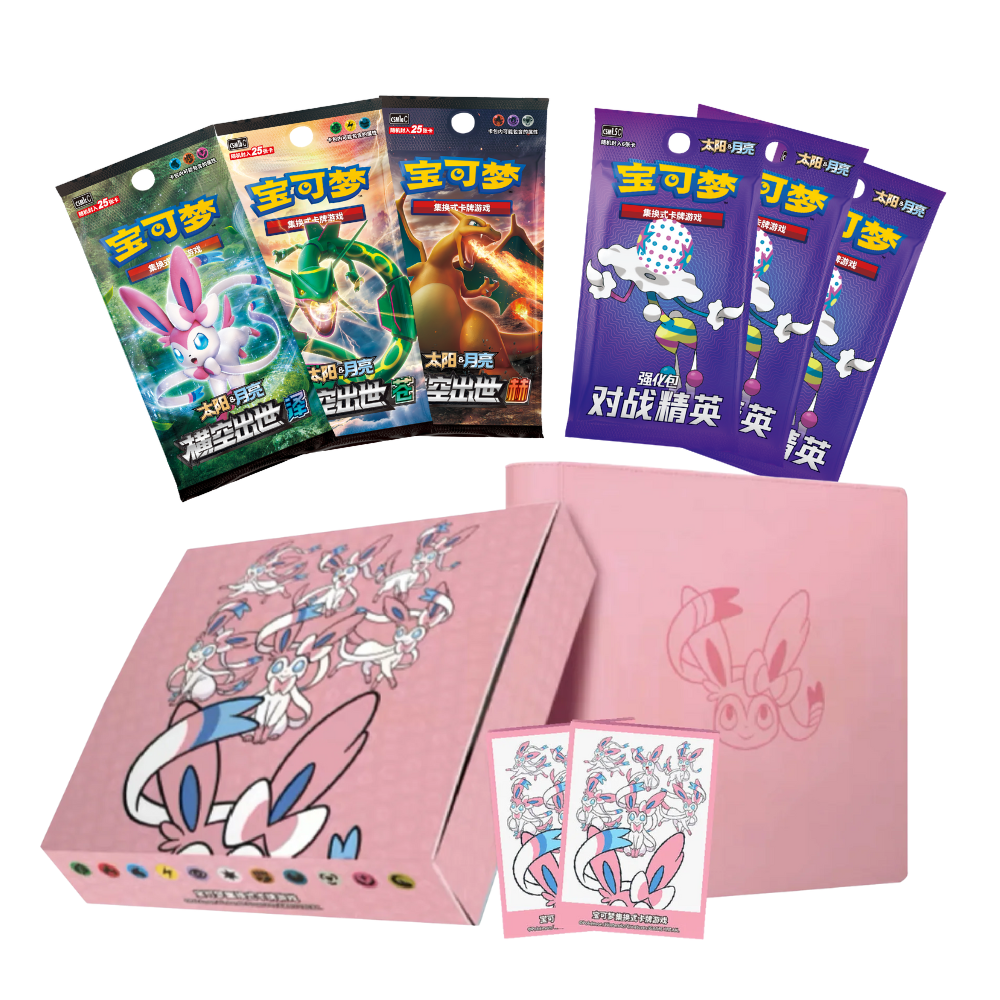 Följ med in i en magisk värld med Sylveon GX Rainbow Rare i spetsen! Denna vackert designade presentbox är ett drömköp för samlare av Eeveelutions och innehåller både boosterpack, sleeves och ett slumpmässigt Eevee GX-kort – exklusivt för den kinesiska marknaden.