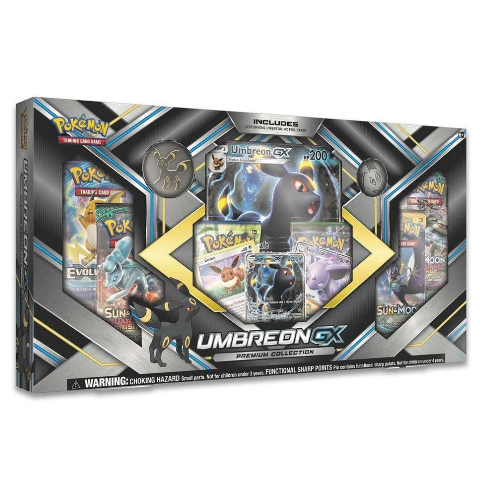 Umbreon-GX kliver ut ur skuggorna med kraftfulla attacker som Shadow Bullet och Dark Call-GX. I denna premiumkollektion får du inte bara Umbreon-GX som glänsande promokort och oversized version, utan även samlarkort på Espeon-GX och Eevee, samt exklusiva tillbehör som pin och mynt. Ett måste för Eeveelution-fans!