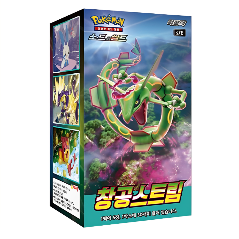 Ge dig ut bland skyhöga strider och kraftfulla drag med den sydkoreanska versionen av Blue Sky Stream s7R – en boosterbox laddad med episka kort och legendariska Pokémon!