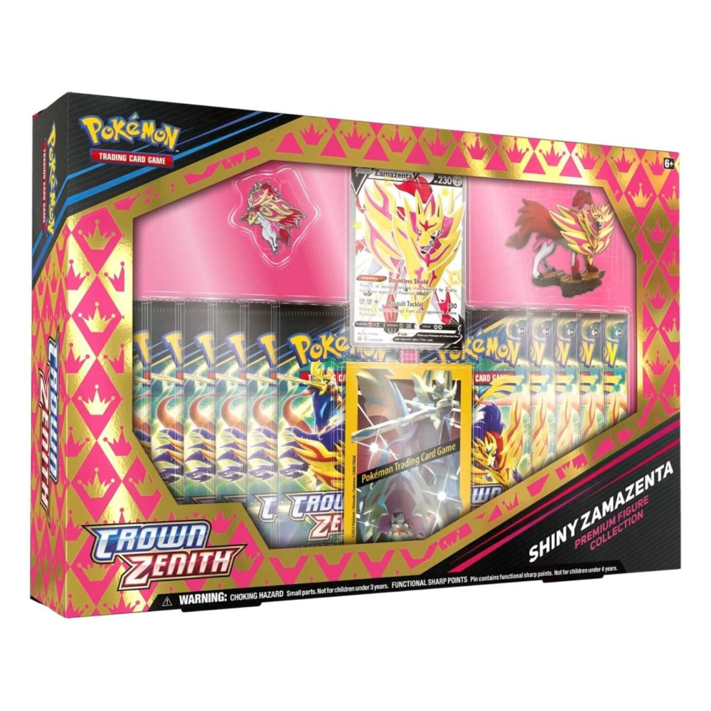 Shiny Zamazenta har anlänt med ny kunglig glans! Med sin starka förmåga att blockera attacker från Pokémon VMAX och sin magnifika lila-guld-färg, är denna exklusiva samlarbox ett måste för både spelare och samlare. Boxen innehåller en glänsande Zamazenta V-promo, figur, brosch, kortskydd och hela 11 Crown Zenith boosterpack – en episk utgåva!