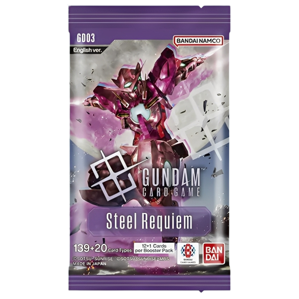 Explore the Gundam Steel Requiem (GD 03) Booster Pack , an English edition packed with exciting cards from the popular Gundam series. Each booster pack contains 13 cards , including the ability to draw rare, holo, and special cards, making every opening exciting for players and collectors alike.