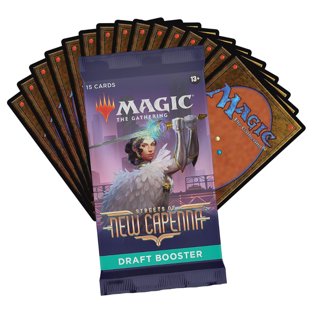 Step into the stylish, crime-ridden metropolis of the Streets of New Capenna . This Draft Booster Pack is perfect for Limited games like Draft and Sealed, or for those who just want to open a pack filled with noir aesthetics, mafia themes, and exciting card variations. With a chance at foils, Metropolis Full-Art Lands, and even ultra-premium Borderless Mythic Planeswalkers, every pack is a potential hit.