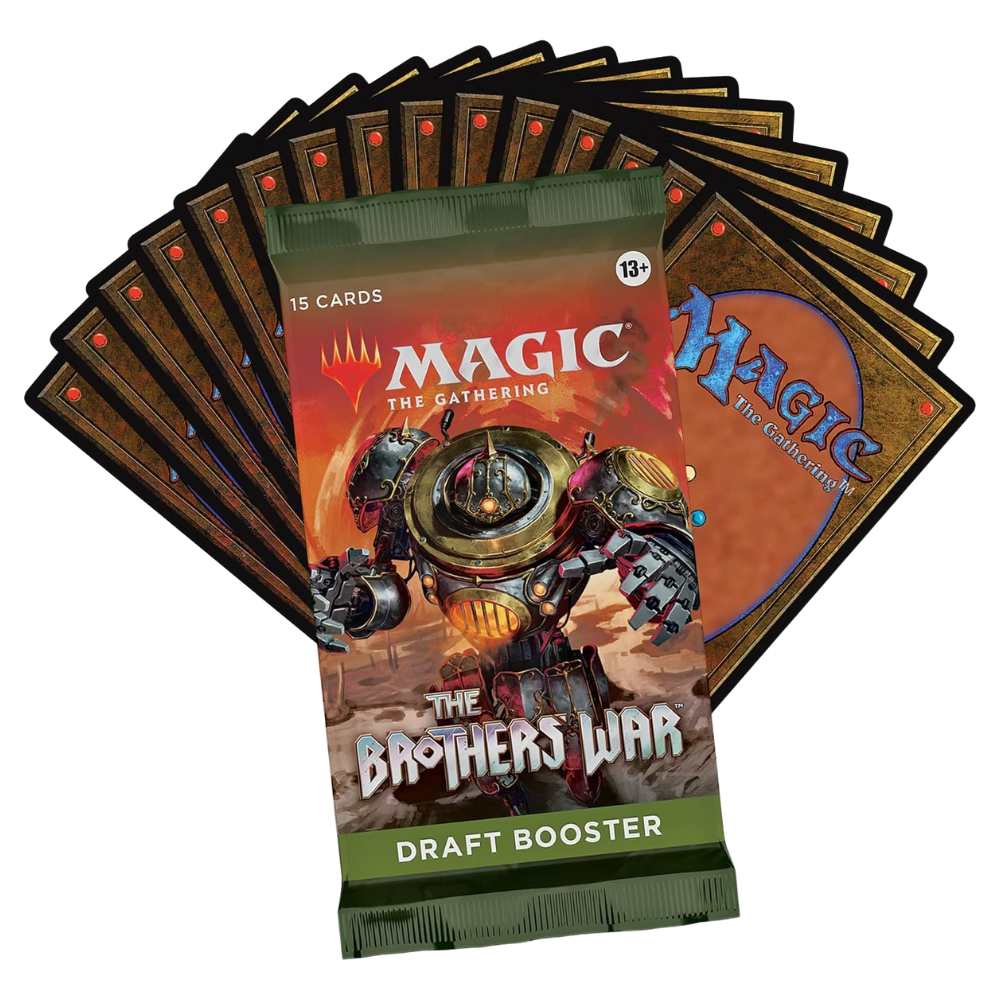 Build your strategy and return to the most iconic conflict in Magic history with The Brothers' War Draft Booster Pack . Each pack contains 15 cards designed for Draft and Sealed, filled with powerful artifacts, retro-inspired cards, and the ability to open Rare or Mythic in each booster.