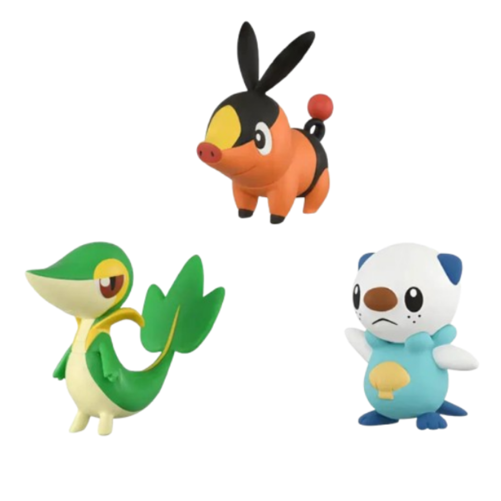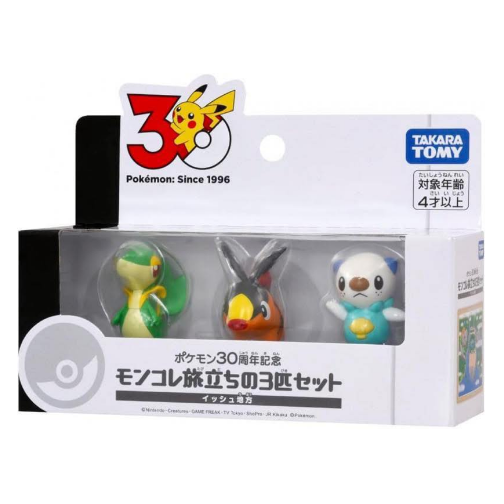 Celebrate Pokémon's 30th Anniversary with the Moncolle Journey Figure Set, featuring the Unova region's starter Pokémon: Snivy, Tepig, and Oshawott. Part of the Pokémon 30th Anniversary x MonColle series, this authentic Japanese figure set from Takara Tomy features high-quality PVC figures with detailed designs. Perfect for collectors and fans who want premium quality official Japanese Pokémon figures.