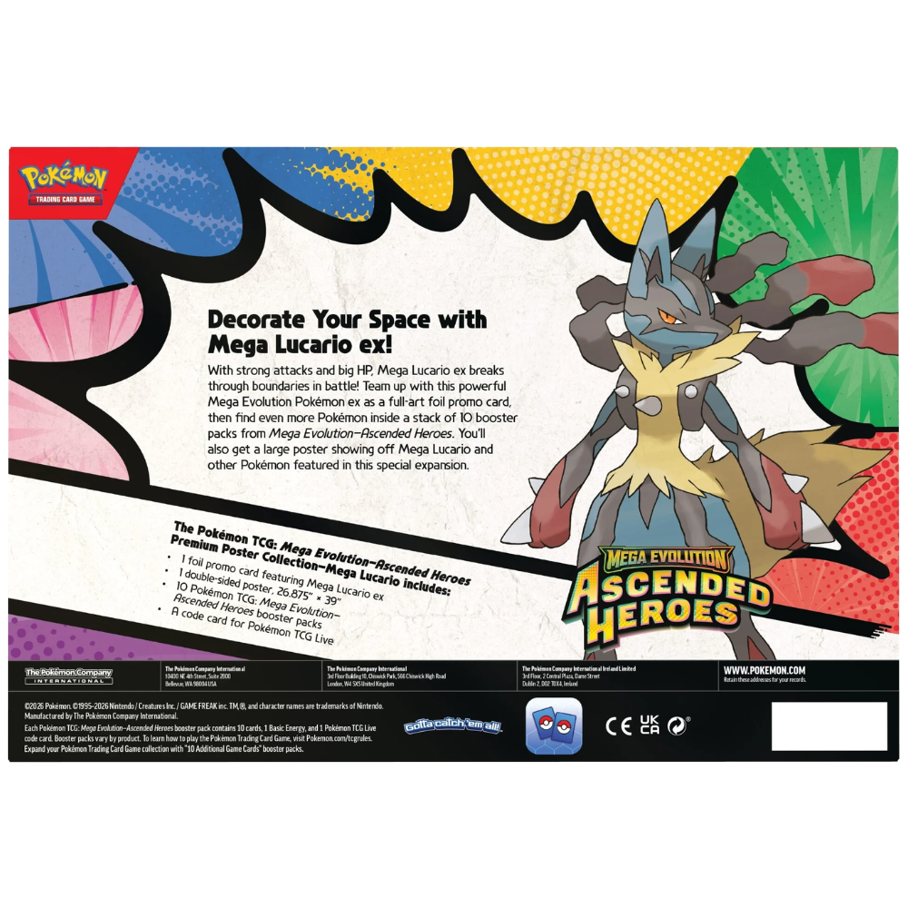 Step into the Mega Evolution era with this exclusive Ascended Heroes Premium Poster Collection , centered around the legendarily popular Mega Lucario ex . With its powerful attacks, high HP, and steely aura, Mega Lucario is a favorite with players and collectors alike.