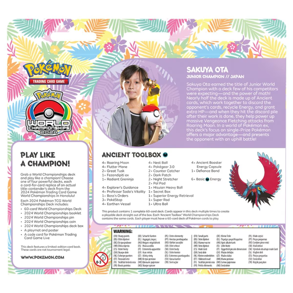 Explore the power of Sakuya Ota's Ancient Toolbox , the winning deck from the Junior Division at the 2024 Pokémon TCG World Championships in Honolulu! This pre-built 60-card deck is an exact replica of the champion's own roster—packed with Ancient Pokémon, clever energy recovery, and powerful, low-risk attacks!