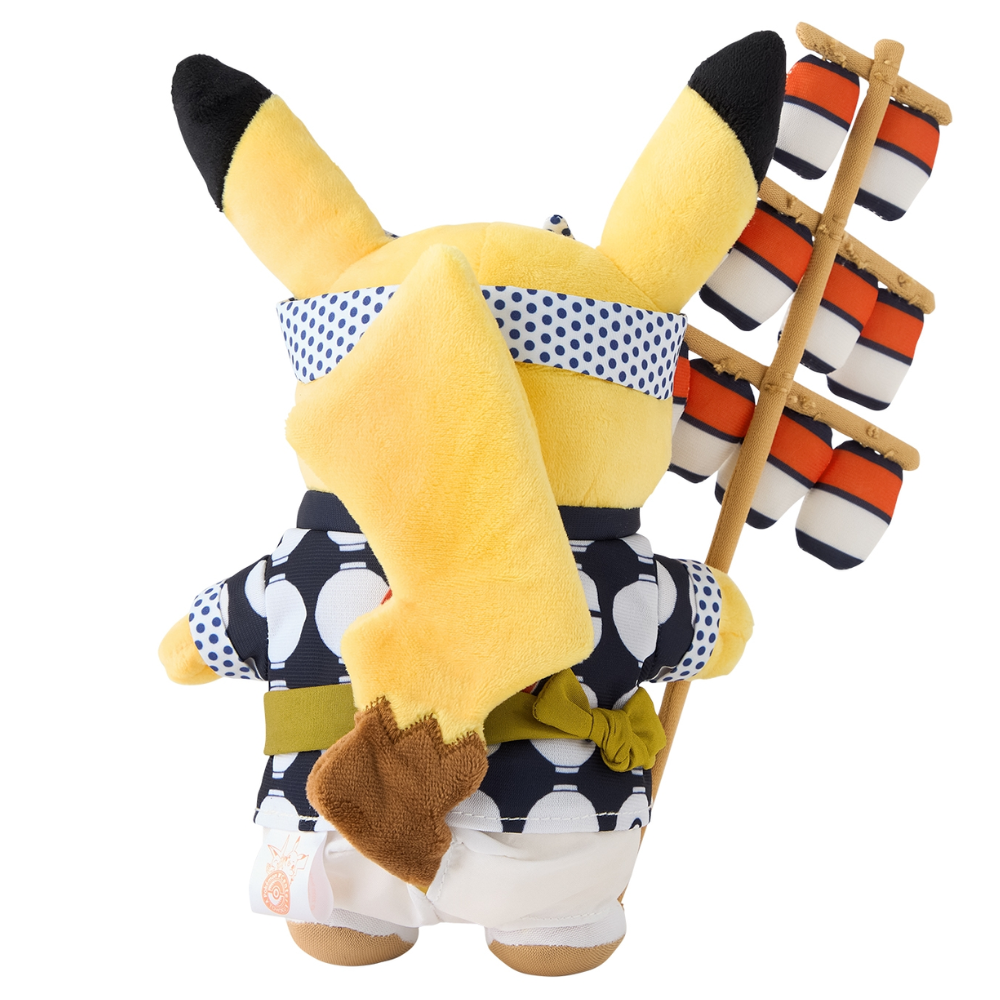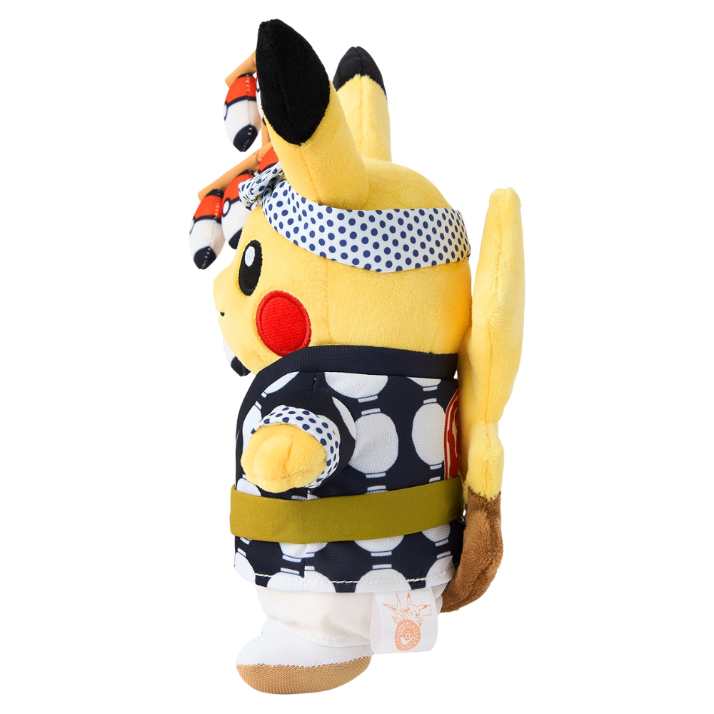 This charming Pikachu plush toy is dressed to take part in the spectacular Kanto Festival in Akita Prefecture. The back of the costume is adorned with a design featuring Landorus , known as the " God of the Fields ", symbolizing a prayer for a good harvest and the power of nature.
