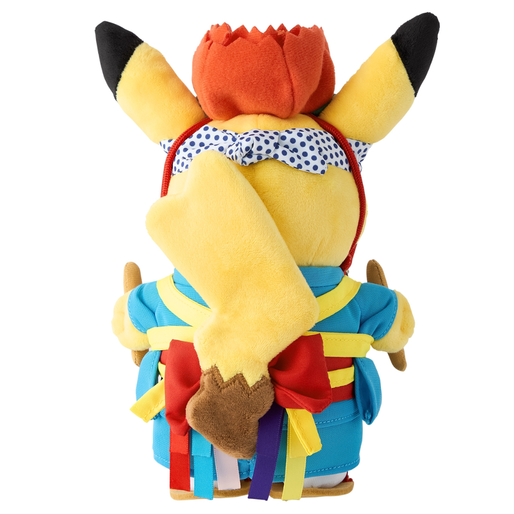 This adorable Pikachu plush toy depicts Pikachu dancing energetically to Sansa Odori , one of Tohoku's most famous summer festivals. Pikachu holds a drum with a Hariteyama design , adding a cool touch to the festival's traditional look.