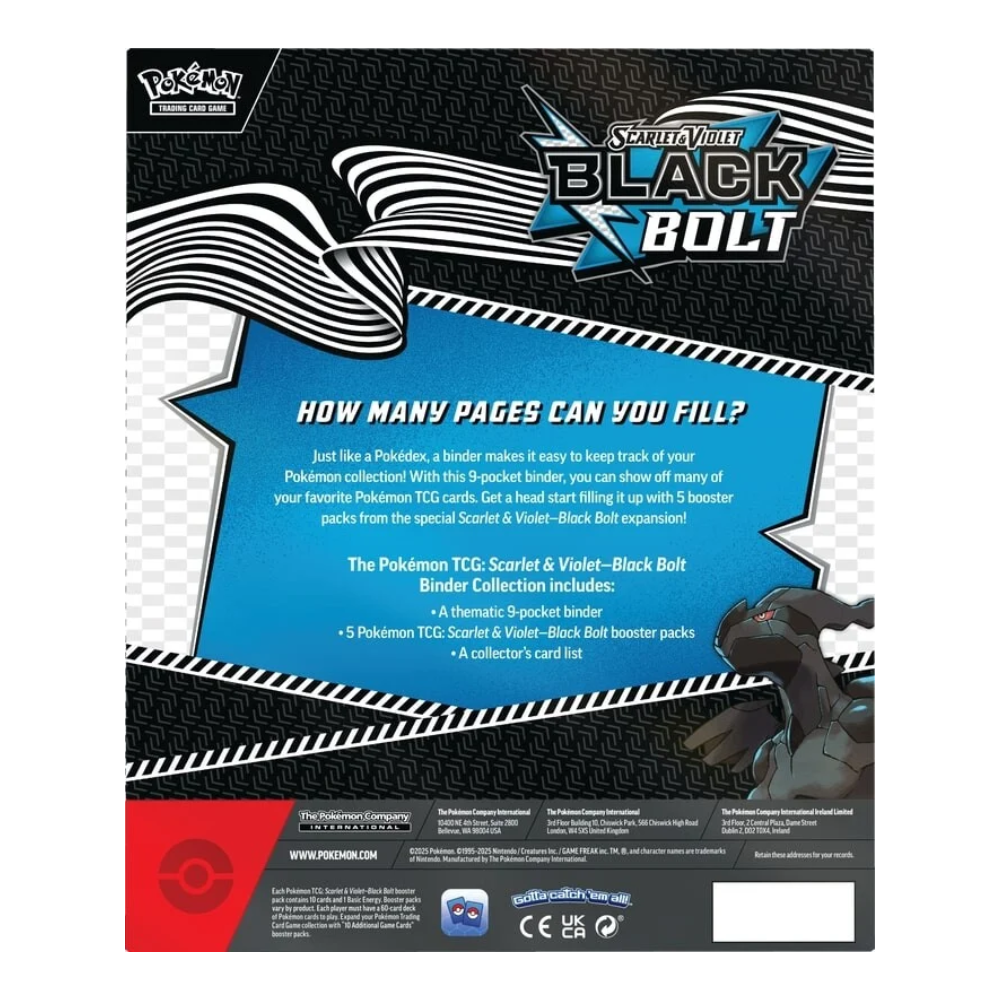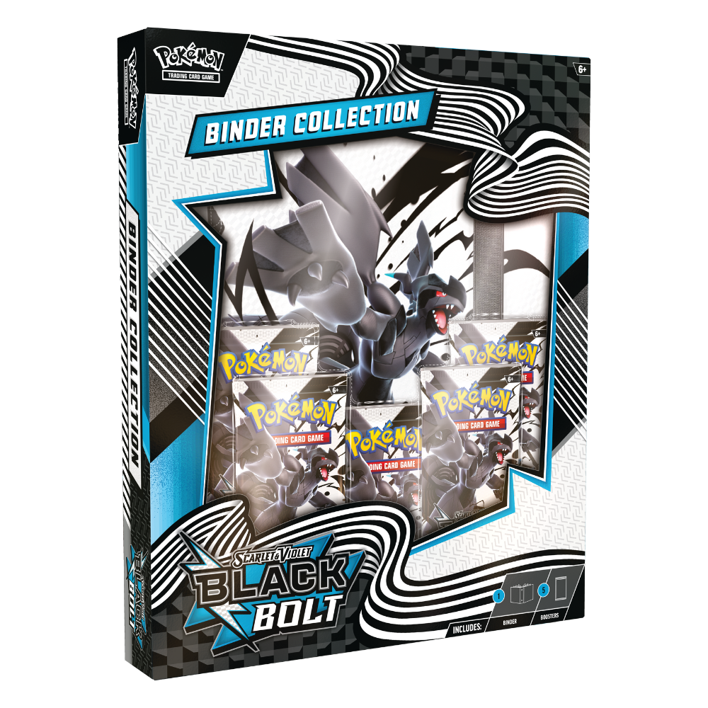 Reunite with the Unova region's iconic Pokémon in this exclusive Black Bolt Binder Collection Box ! Featuring five booster packs and a stylish collector's binder featuring Zekrom or Reshiram , this is a must-have for players and collectors alike.