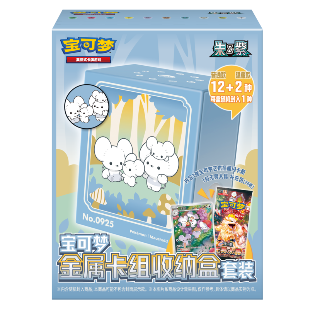 Explore the beautiful intersection of collectible value and functionality with this exclusive Metal Card Deck Storage Set Collection Box from the Scarlet & Violet series . Each box contains an Art Rare foil card , a custom metal storage case , and a booster pack from the latest Japanese expansion: Fearless Terastal .