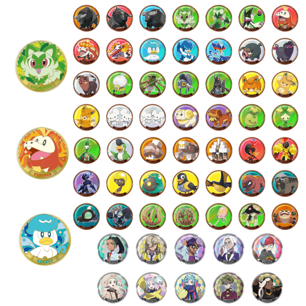 Regular (49 types): Motifs by Sprigatito, Fuecoco, Quaxly and others, with reddish-brown brass color.