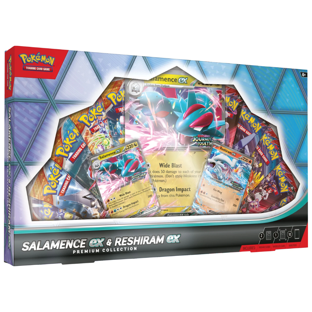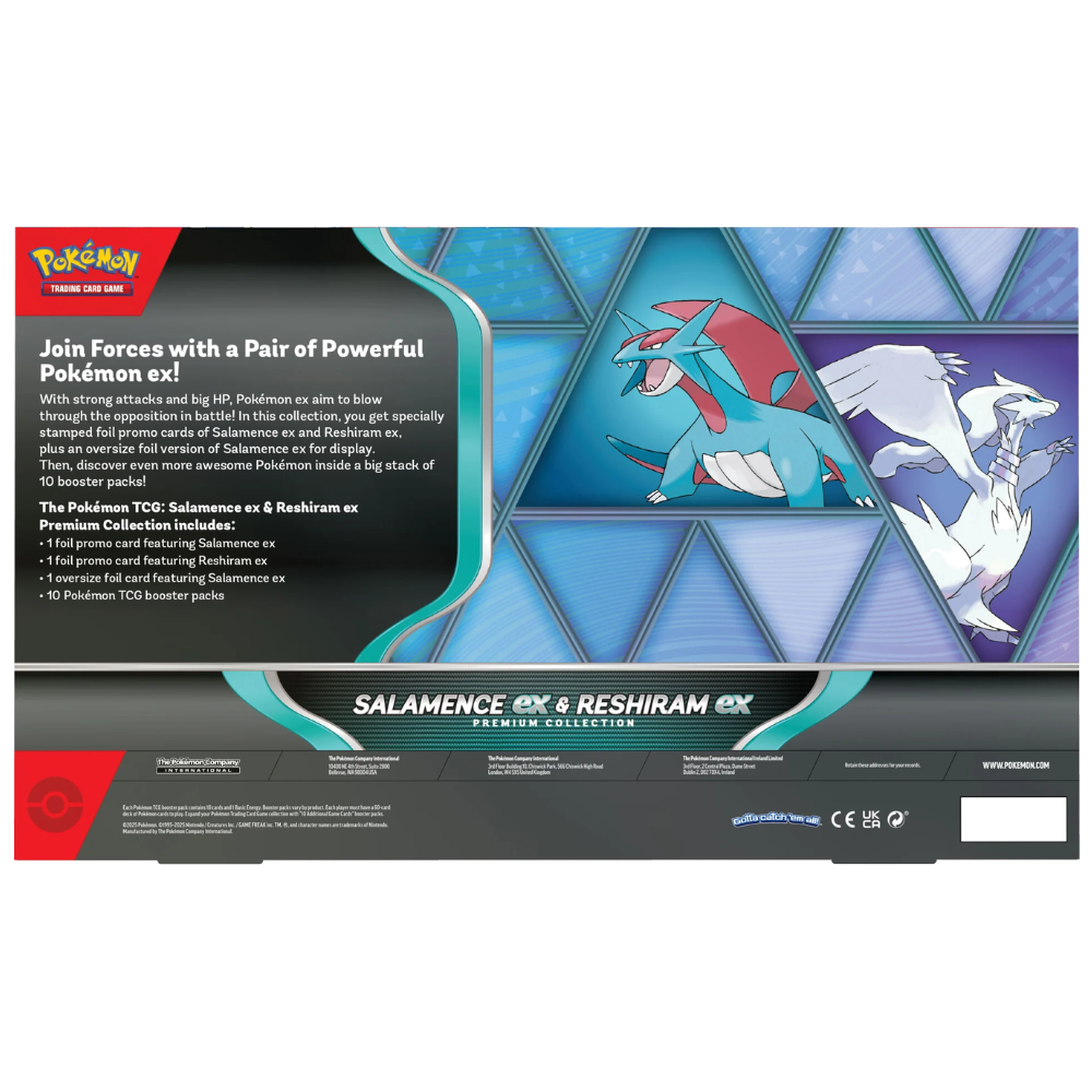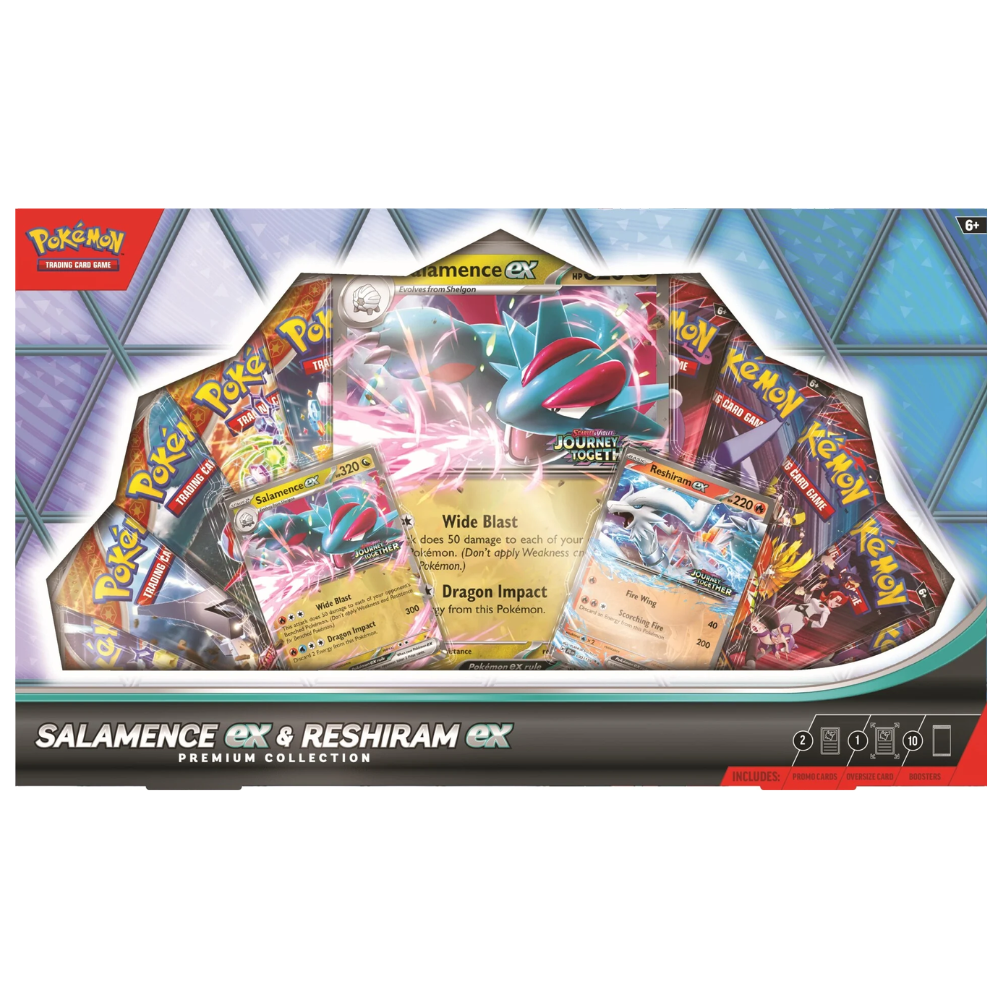 Two of Pokémon's most awe-inspiring dragons unite in this Premium Collection Box , ready to dominate the battlefield! With powerful attacks and high HP, Salamence ex and Reshiram ex give you an advantage in every match. The box also includes an impressive oversize foil card of Salamence ex - perfect to display in your collection!