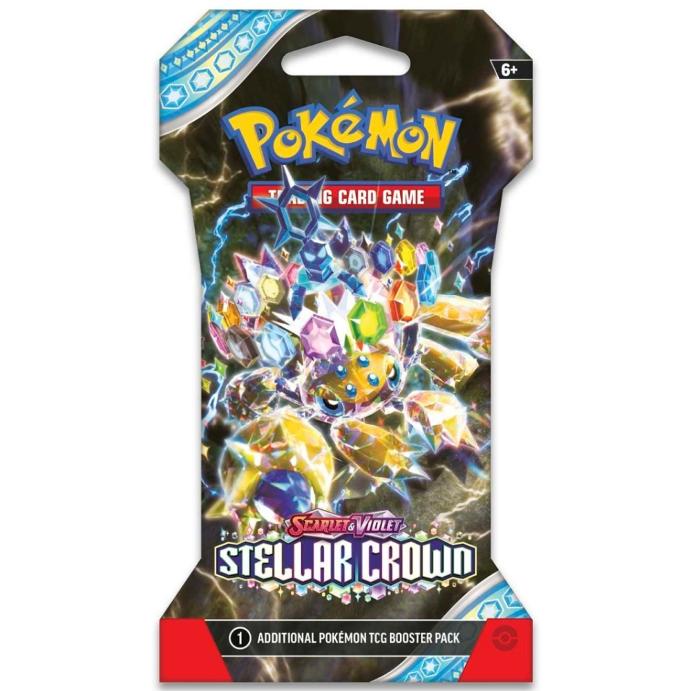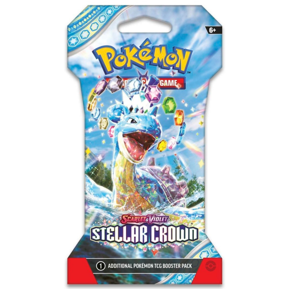 Embark on an adventure that awakens the power within you with the Pokémon Scarlet & Violet: Stellar Crown Sleeved Booster Pack! Dive into a world beneath the surface and discover the true potential of the Terastal phenomenon. Legendary Pokémon Terapagos takes the throne, along with Cinderace ex, Lapras ex, and Galvantula ex, all with brilliant new powers like Stellar Tera Pokémon ex. The newly discovered Hydrapple ex leads more Pokémon ex into battle, and ACE SPEC cards continue to change the game in the Pokémon TCG: Scarlet & Violet—Stellar Crown expansion.