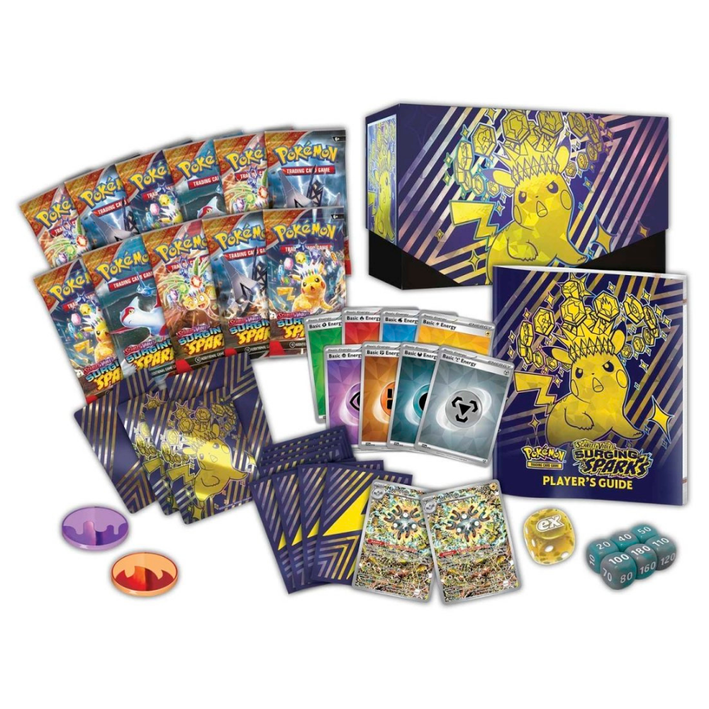Enter a world of star power with Pokémon Scarlet & Violet: Surging Sparks Elite Trainer Box (9 Pack)! A powerful storm of electricity sweeps across a tropical landscape, creating the perfect backdrop for the supercharged Pikachu ex! With the energy of a Stellar Tera Pokémon ex, it lights up the beach and reveals an impressive procession of Dragon Pokémon, including the majestic Alolan Exeggutor ex! Archaludon ex and Latias ex complete this fantastic line-up, while new Ace Spec cards and more exciting Pokémon ex bring unexpected surprises. IP okémon TCG: Scarlet & Violet—Surging Sparks expansion sparks energy and dragons roar!