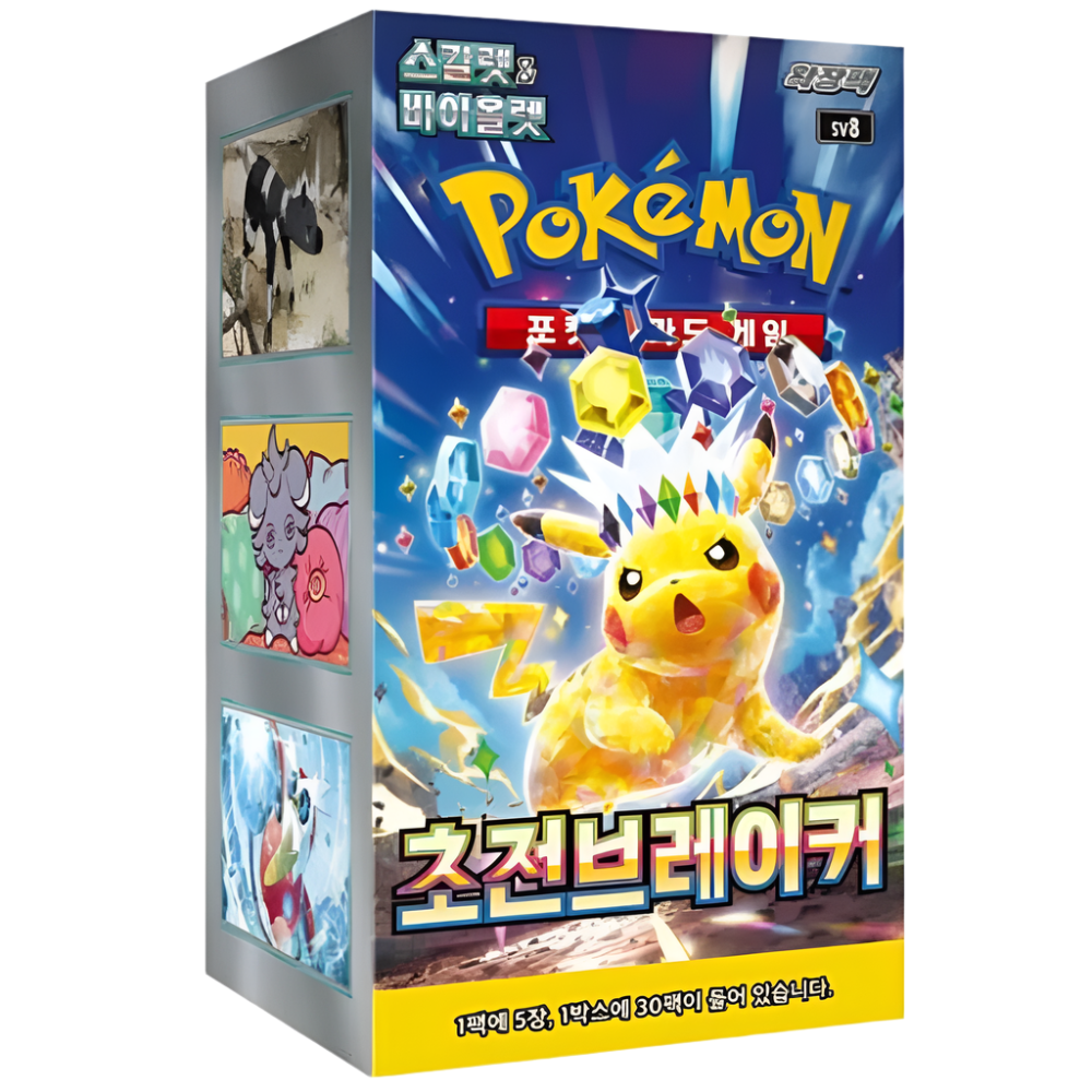 Let the sparks fly with Surging Sparks SV8! For those looking to take your Pokémon Scarlet & Violet collection to the next level, this Booster Box (Korean Edition) gives you maximum chances at rare cards and secret treasures.