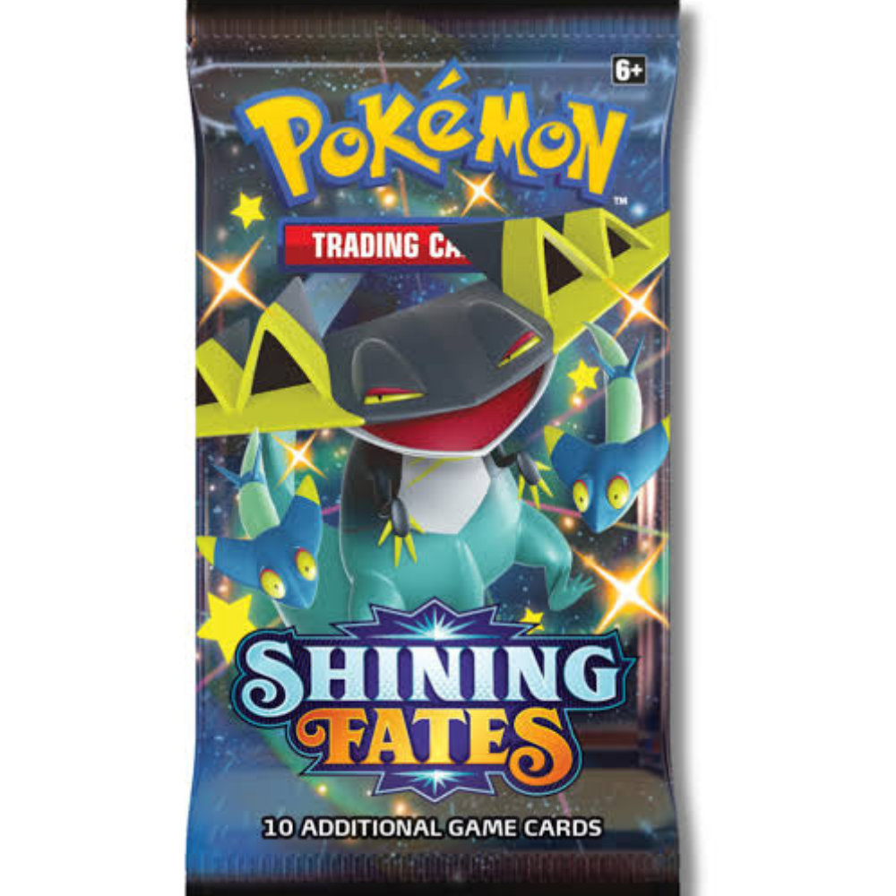 Explore the magical world of Pokémon Shining Fates with this booster pack! Each pack contains 10 cards filled with rare, shiny Pokémon from the Galar region, including the coveted Shiny Charizard Gigantamax .