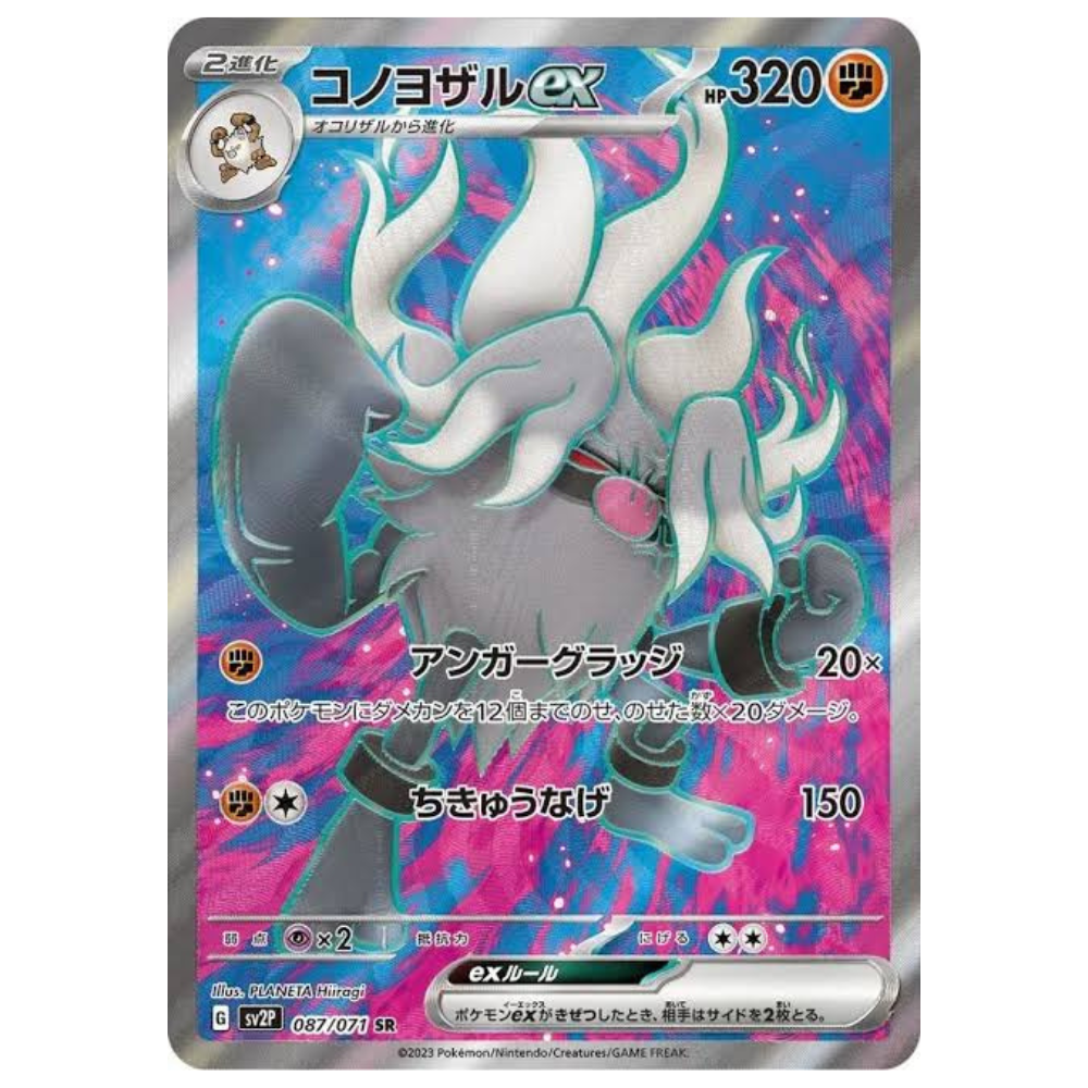 Give your Pokémon deck a powerful boost with the Annihilape ex Secret Rare (SR) card from the Snow Hazard set! This Japanese card (SV2P 087/071) features Annihilape, the Ghost/Fighting-type Pokémon with an impressive design and devastating powers. The card is in Near Mint condition and adds both visual and gameplay strength to your collection.