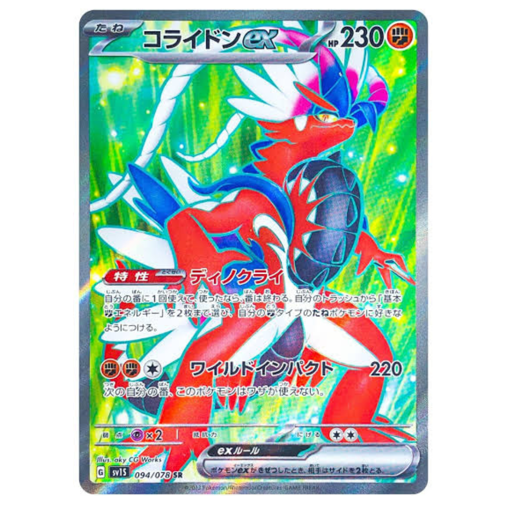 Upgrade your collection with the Koraidon ex Secret Rare (SR) card from the Scarlet ex set! This Japanese card (sv1S 094/078) features Koraidon, the Ancient Dragon-type Pokémon with a spectacular Full Art design. As an Ultra Rare, this card is a great addition to the Sword & Shield collection.