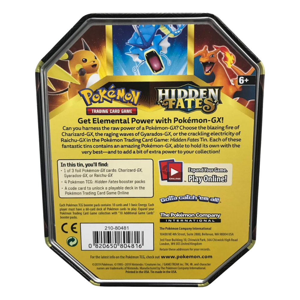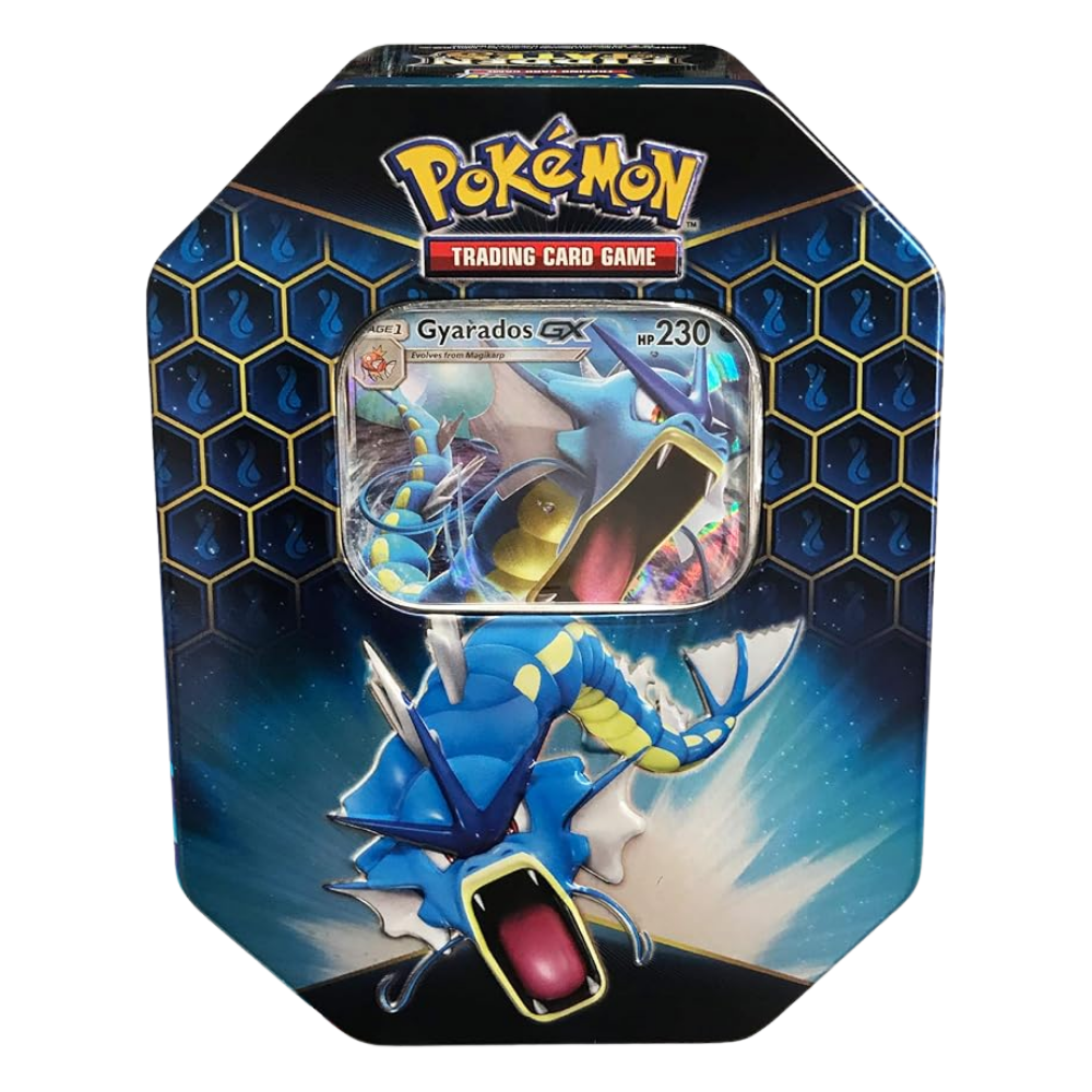 Experience the exciting Hidden Fates expansion with the Gyarados GX Tin from Pokémon Sun & Moon. This English set combines an exclusive foil Gyarados-GX , four booster packs from Hidden Fates, and a code card for the Pokémon TCG Online - perfect for collectors and players alike.