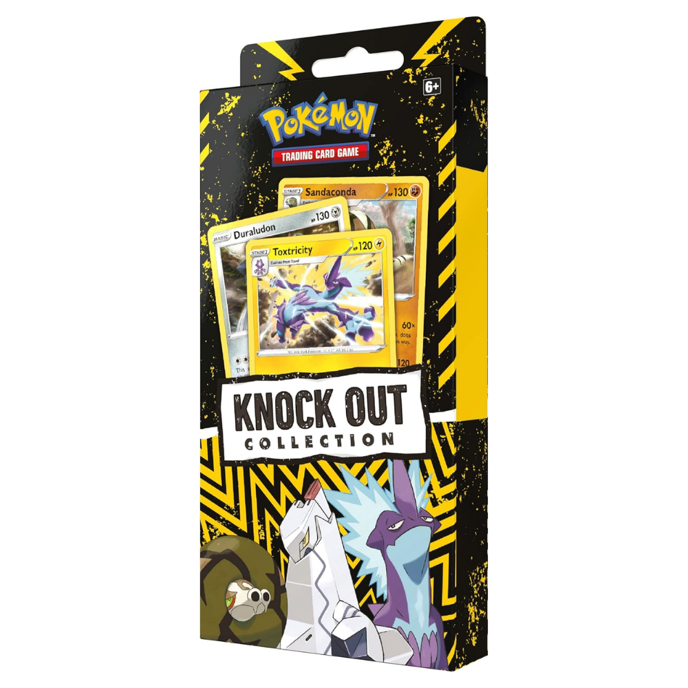 Tre coola Pokémon – ett grymt set! Pokémon TCG: Knock Out Collection med Toxtricity, Duraludon och Sandaconda är ett perfekt tillskott för både samlare och spelare. Denna box innehåller tre kraftfulla foilkort från Galar-regionen, två booster packs att öppna samt ett glänsande metallmynt som kan användas i spel eller visas upp i samlingen.